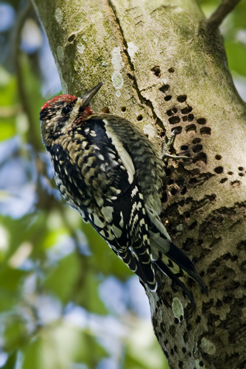 Sapsuckers get their name from their habit of boring a repeating pattern of holes into a tree and letting the sap run down the trunk.